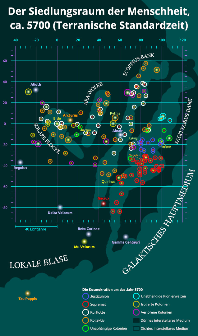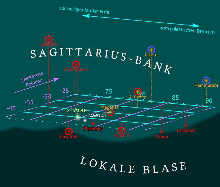 Die Sagittarius-GalerieMein Science-Fiction-Romanprojekt Der Sagittarius-Krieg stellte mich gleich in mehrfacher Hinsicht vor unerwartete Herausforderungen. Nicht nur erwies sich die Recherche über Astronomie und Raumfahrttechnik als überraschend aufwändig, nein: ich musste auch eine vollständig neue Raumschiffästhetik entwickeln. Keins der in der SF etablierten Designs wurde den Anforderungen gerecht, die sich mir in meiner Recherche präsentierten. Dies führte dazu, dass ich bereits im Vorfeld etliche Skizzen und Grafiken erstellen musste, allein um selbst ein Bild davon zu haben, worüber ich eigentlich schreibe. Ich brauchte Sternenkarten, um mir die Reisen meiner Protagonisten zu vergegenwärtigen und Skizzen von zumindest dem wichtigsten Raumschiff, auf dem sich ein Großteil der Handlung abspielt. Die Ergebnisse präsentiere ich hier für alle, die neugierig auf die Bildwelten des Sagittarius-Krieges sind.